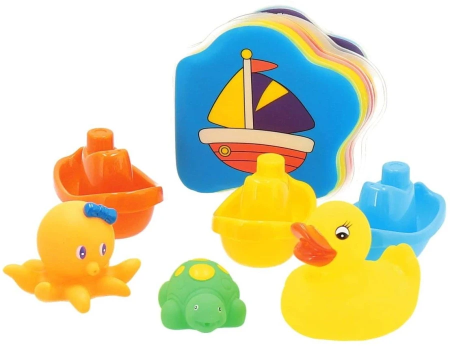 De set bestaat uit een badboekje, 3 bootjes en 3 knijpspeeltjes. De vrolijke kleuren van het speelgoed zullen je kindje zeker aanspreken! De knijpspeeltjes spuiten met water en het boekje maakt een geluidje wanneer je kindje er in knijpt. In bad gaan was nog nooit zo leuk!