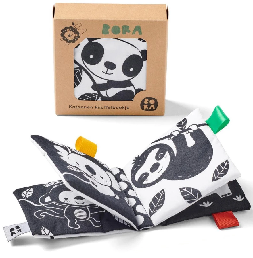 Wat een leuk boekje is het Bora in de dierentuin kinderboek!ย Het boekje is gemaakt van katoen en heeft 8 pagina’s met mooie dieren illustraties, van bijvoorbeeld een aap en panda. De illustraties zijn in zwart wit, omdat pasgeboren baby’s afbeeldingen beter kunnen zien in hoog contrast.