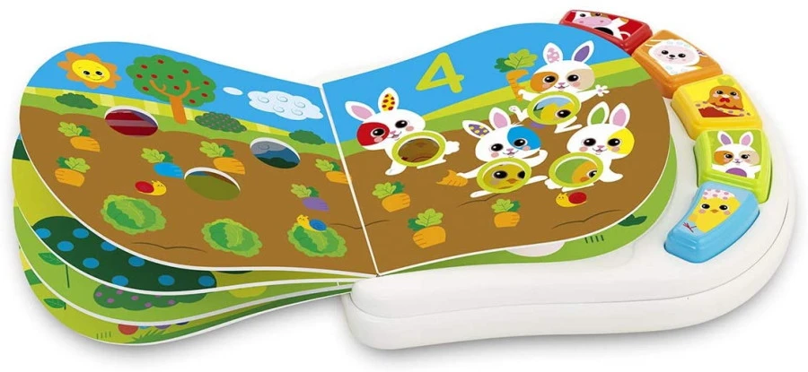 Dit kleurrijke boekje zorgt ervoor dat je kleine op een speelse manier kennis maakt met dieren, dierengeluiden, cijfers en vormen. De bladzijden zijn, door het gat in het midden, makkelijk om te slaan. Daarnaast heeft het boekje aan de zijkanten drukknoppen met verschillende dierengeluiden. Elk dierengeluid hoort bij het dier op de pagina. Je kindje kan op deze manier het passende geluid bij elke pagina zoeken.