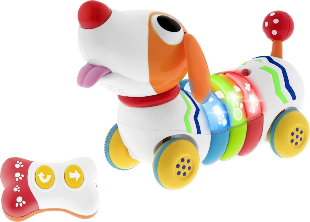 Het hondje zelf heeft op zijn rug twee verschillende muziekjes en wel 5 gekleurde knoppen waar je kindje op kan drukken. Ook kan hij zijn staartje laten kwispelen! De infrarood afstandsbediening in de vorm van een hondenbotje heeft twee knoppen om de hond voor- en achteruit te laten bewegen. Zo kan je kleine samen met DogReMi in huis rondwandelen!