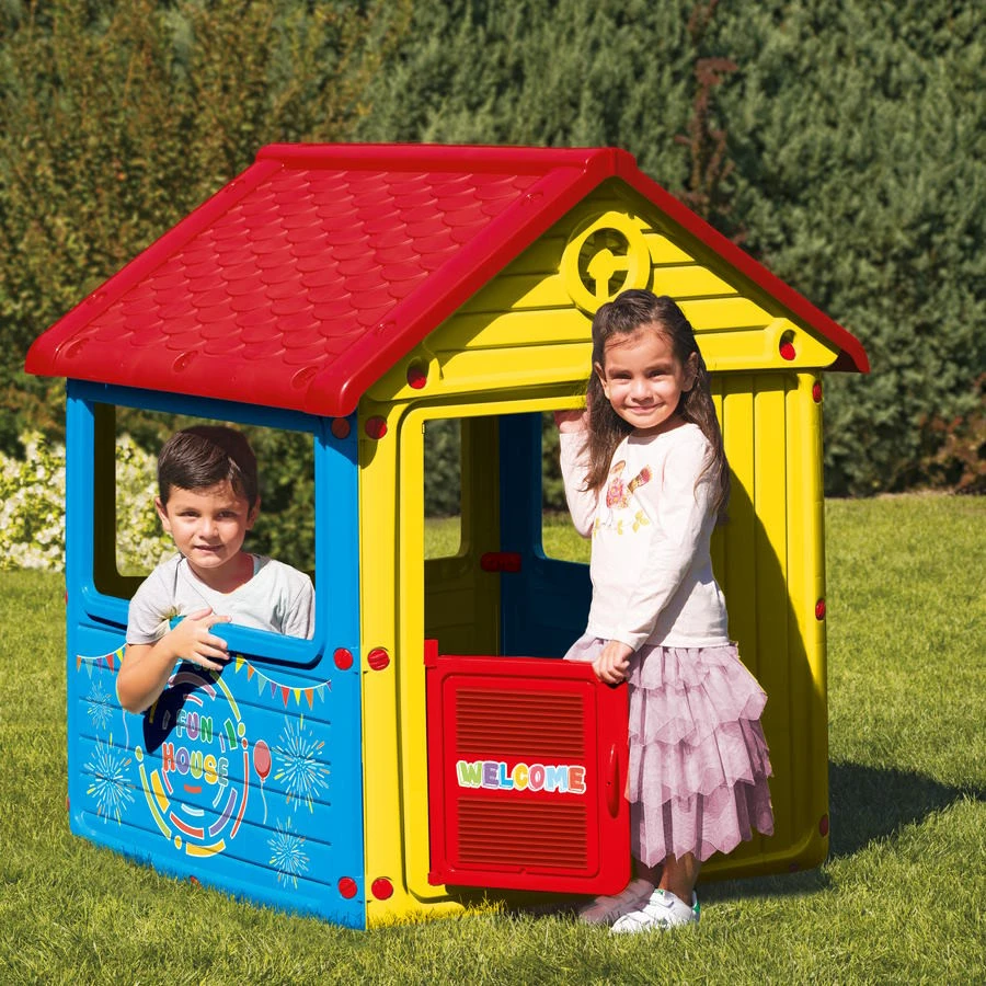 Het huisje biedt veel mogelijkheden: je kindje treedt gemakkelijk naar buiten- en binnen door het rode werkende deurtje. Gaat het nou regenen? Dan houdt het grote dakje de kindjes droog en hebben ze een echte stoere schuilplaats! Het voelt net als een echt huis!