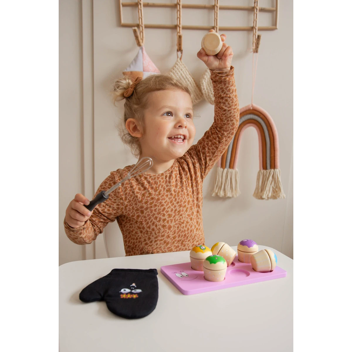 De houten cupcake set van Label Label bestaat uit zes cupcakes, met ieder een andere topping. De toppings zitten met klittenband vast, waardoor het spelen nog leuker wordt door combinaties te maken. Daarnaast wordt het bakplaatje, de garde én het ovenwandje meegevelerd.