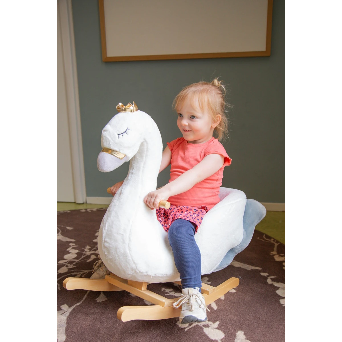Wanneer je op het knopje van deze hobbelzwaan aan de zijkant van de nek drukt zal zij een echt dierengeluidje maken. Het voelt net alsof het een échte zwaan is! Daarnaast is het hobbeldier mooi vormgegeven en heeft zij zelfs vleugels en prachtige oogjes waardoor ze een echte toevoeging voor de babykamer zal zijn.
