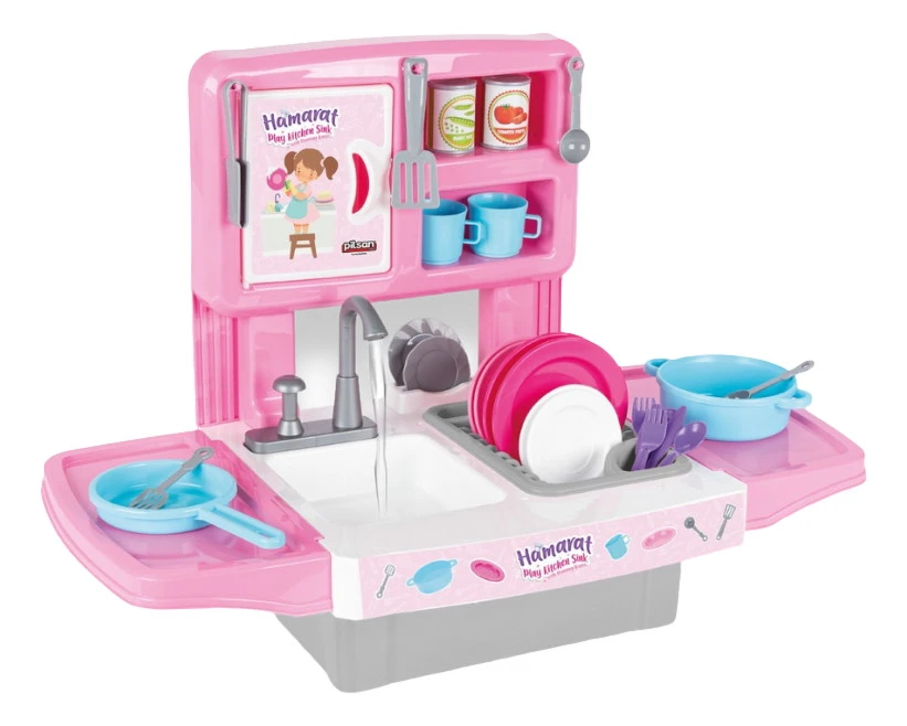 Is jouw kindje ook een keukenprins of -prinses? Laat de fantasie de vrije loop met deze uitgebreide Speelgoed Keukenset van Pilsan. Het unieke aan deze set is de écht werkende waterkraan waar je kindje eindeloos mee kan spelen! Onder de gootsteen zit een waterreservoir van 10 liter waar het water uitgepompt wordt. De kraan heeft namelijk een drukknop die ervoor zorgt dat het water uit de kraan stroomt! Je hoeft het water niet bij te vullen, omdat het water terug het reservoir instroomt via het afvoerputje. Handig!